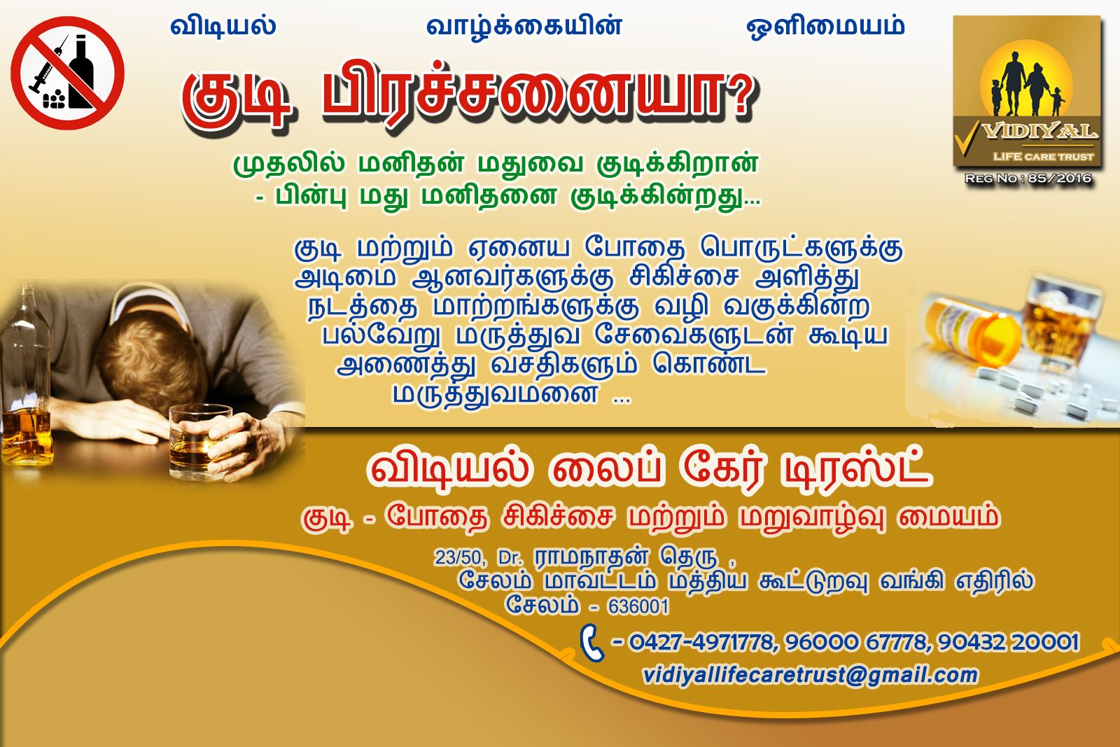 Vidiyal Life Care Trust is a de-addiction center for rehabilitation of alcohol and drug dependents. It is licensed by the institute of mental health government of Tamil Nadu. The center is well setup for counselling classes, quality food, during place and bunker cotes for bed treatment. Our goal the institute is to give sober life and humanize the rehabilitation process also the mission is to integrate the mainstream. Which focuses on the family and social understanding of illness and therapeutic intervention such as group therapies and occupational therapies are offered about 13 experienced staff members including Professional, caregiver and employee. Under the guidance of psychiatric doctor and general physician.